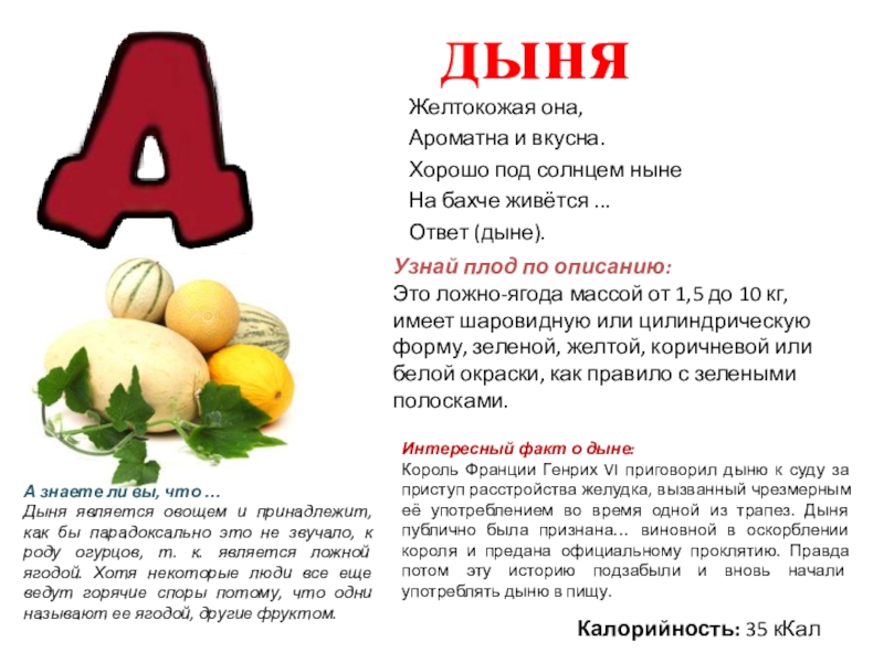 Король Франции Генрих VI приговорил дыню к суду за приступ расстройства желудка, вызванный чрезмерным её употреблением во время одной из трапез. Дыня публично была признана… виновной в оскорблении короля и предана официальному проклятию. Правда потом эту историю подзабыли и вновь начали употреблять дыню в пищу.