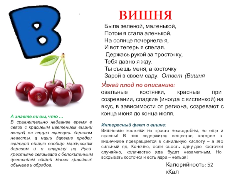 Раннеспелый плод – сочная костянка овальной, шаровидной или сердцевидной формы и самых разнообразных цветов (от светло-желтого до черно-красного).