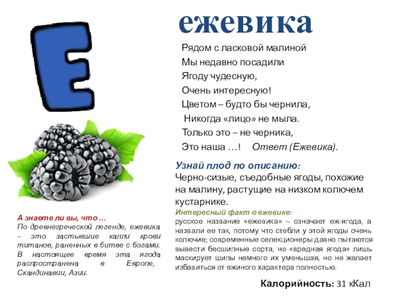 По древнегреческой легенде, ежевика – это застывшие капли крови титанов, раненных в битве с богами. В настоящее время эта ягода распространена в Европе, Скандинавии, Азии.
