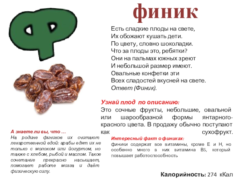 финики содержат все витамины, кроме Е и Н, но особенно много в них витамина В5, который повышает работоспособность