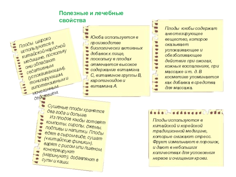 Ююба имеет одно очень интересное свойство. Его листья содержат особое анестезирующее вещество, которое при их жевании на некоторое время парализует восприятие горького и сладкого вкусов. если после этого положить в рот кусочек сахара, то на вкус он покажется не слаще мела. Забавно то, что ощущение кислого и соленого вкусов полностью сохраняется, поэтому засунутые в рот, например, клубника или ананас, мало чем будут отличаться от маринованного огурца.