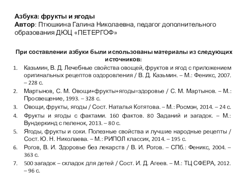 Казьмин, В. Д. Лечебные свойства овощей, фруктов и ягод с приложением оригинальных рецептов оздоровления / В. Д. Казьмин. – М.: Феникс, 2007. – 228 с.