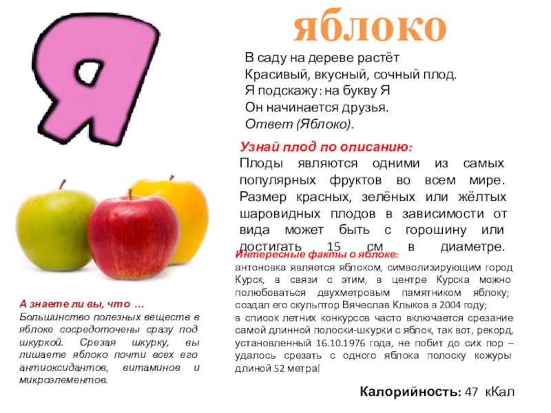 в список летних конкурсов часто включается срезание самой длинной полоски-шкурки с яблок, так вот, рекорд, установленный 16.10.1976 года, не побит до сих пор – удалось срезать с одного яблока полоску кожуры длиной 52 метра!