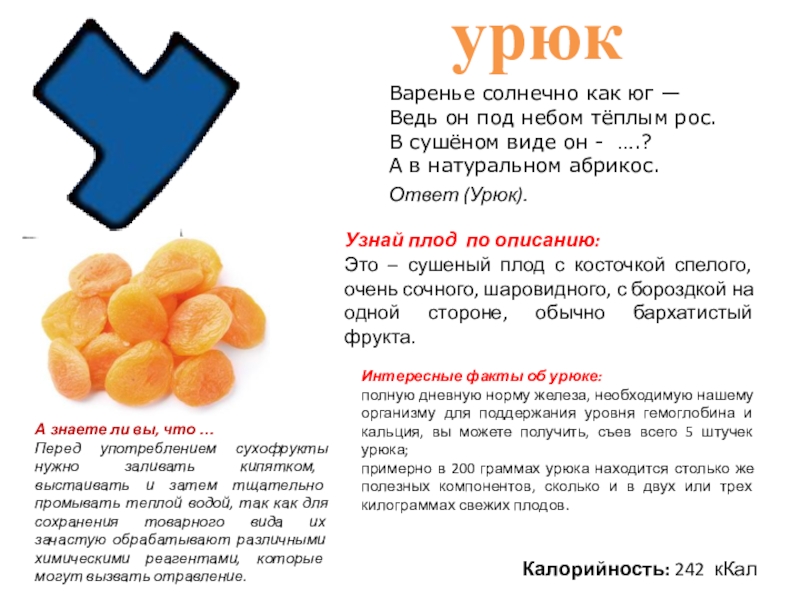 полную дневную норму железа, необходимую нашему организму для поддержания уровня гемоглобина и кальция, вы можете получить, съев всего 5 штучек урюка;