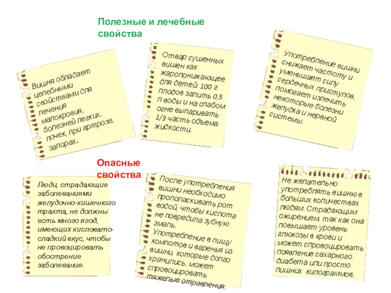 Употребление вишни снижает частоту и уменьшает силу сердечных приступов, помогает излечить некоторые болезни желудка и нервной системы.