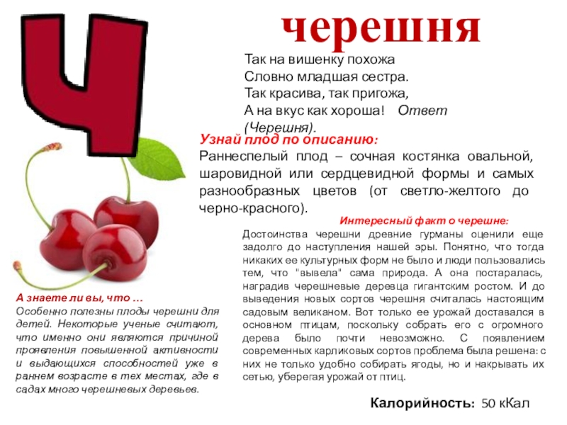 Особенно полезны плоды черешни для детей. Некоторые ученые считают, что именно они являются причиной проявления повышенной активности и выдающихся способностей уже в раннем возрасте в тех местах, где в садах много черешневых деревьев.