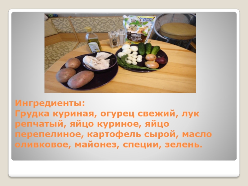 Слайд 2Ингредиенты: Грудка куриная, огурец свежий, лук репчатый, яйцо куриное, яйцо перепелиное, картофель