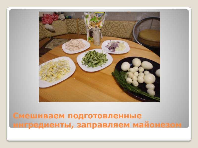 Слайд 9Смешиваем подготовленные ингредиенты, заправляем майонезом