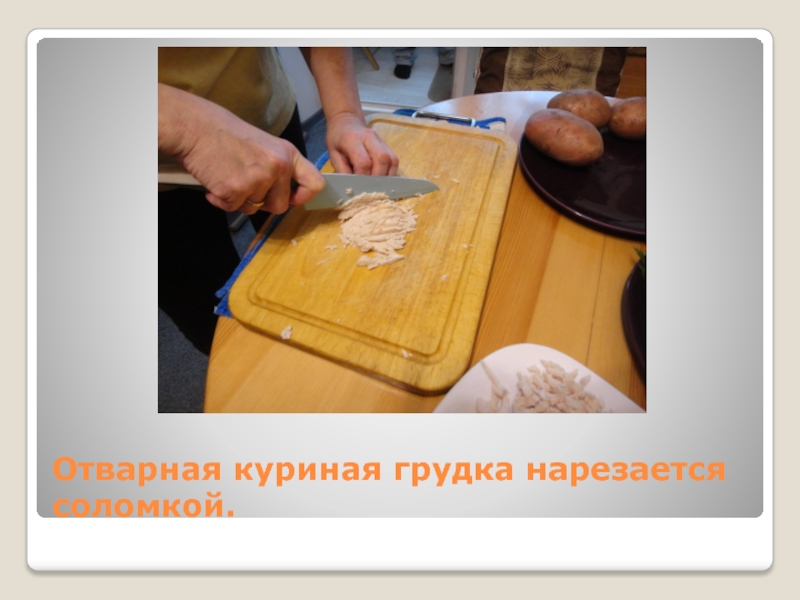 Слайд 3Отварная куриная грудка нарезается соломкой.