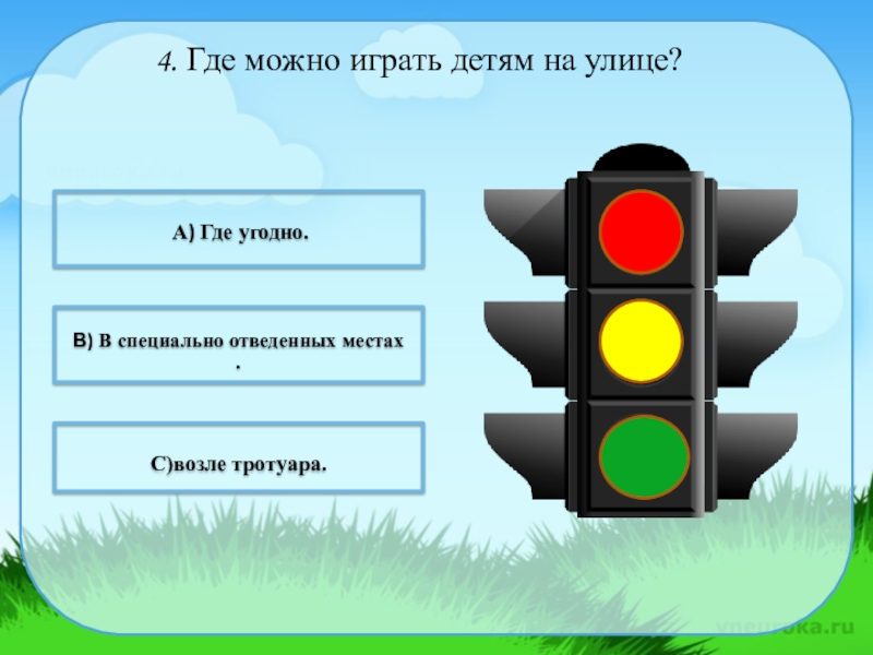 С) Надо дойти до середины проезжей части и ожидать там зеленого сигнала светофора.