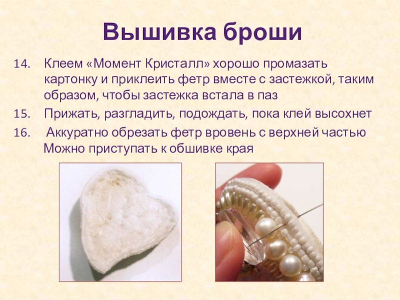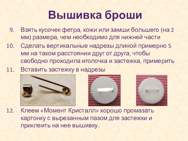 Клеем «Момент Кристалл» хорошо промазать картонку с вырезанным пазом для застежки и приклеить на нее вышивку.