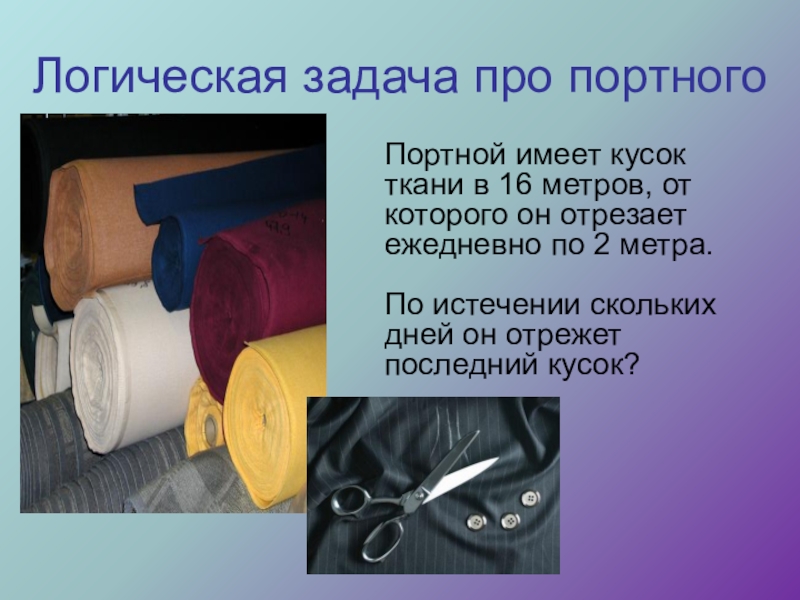 Портной имеет кусок ткани в 16 метров, от которого он отрезает ежедневно по 2 метра.