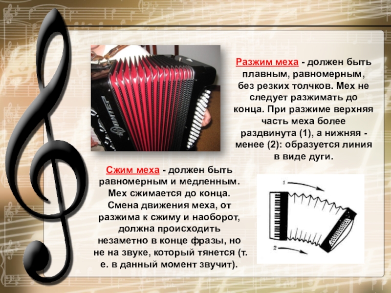 Сжим меха - должен быть равномерным и медленным. Мех сжимается до конца. Смена движения меха, от разжима к сжиму и наоборот, должна происходить незаметно в конце фразы, но не на звуке, который тянется (т.е. в данный момент звучит).