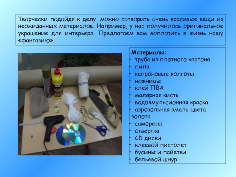 Творчески подойдя к делу, можно сотворить очень красивые вещи из неожиданных материалов. Например, у нас получилось оригинальное украшение для интерьера. Предлагаем вам воплотить в жизнь нашу «фантазию».
