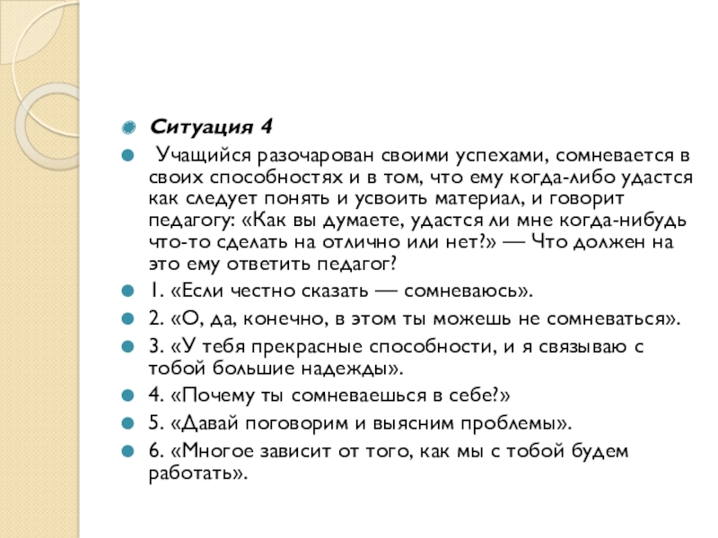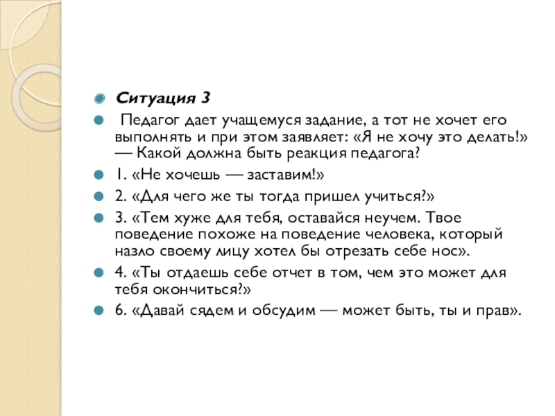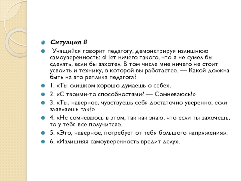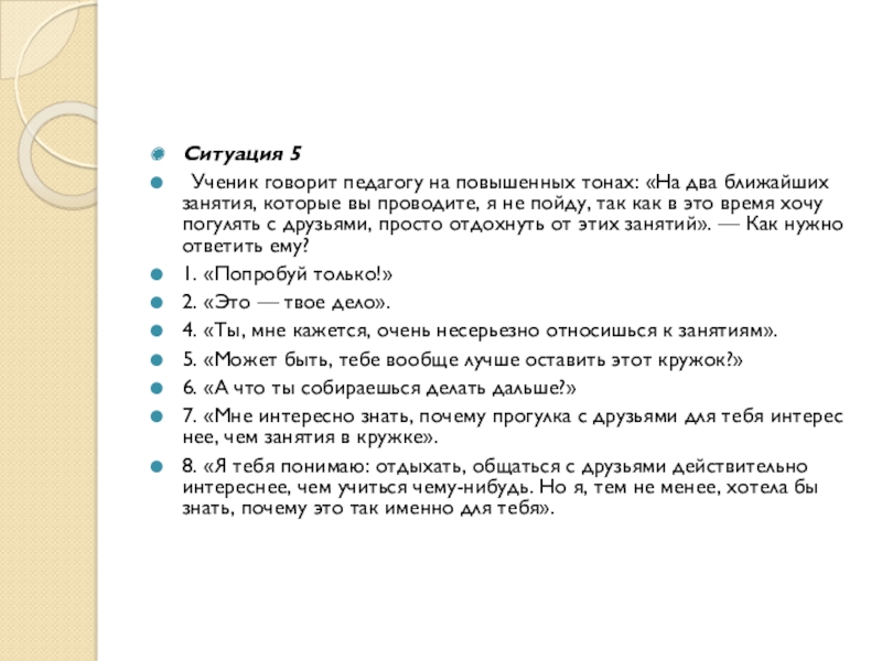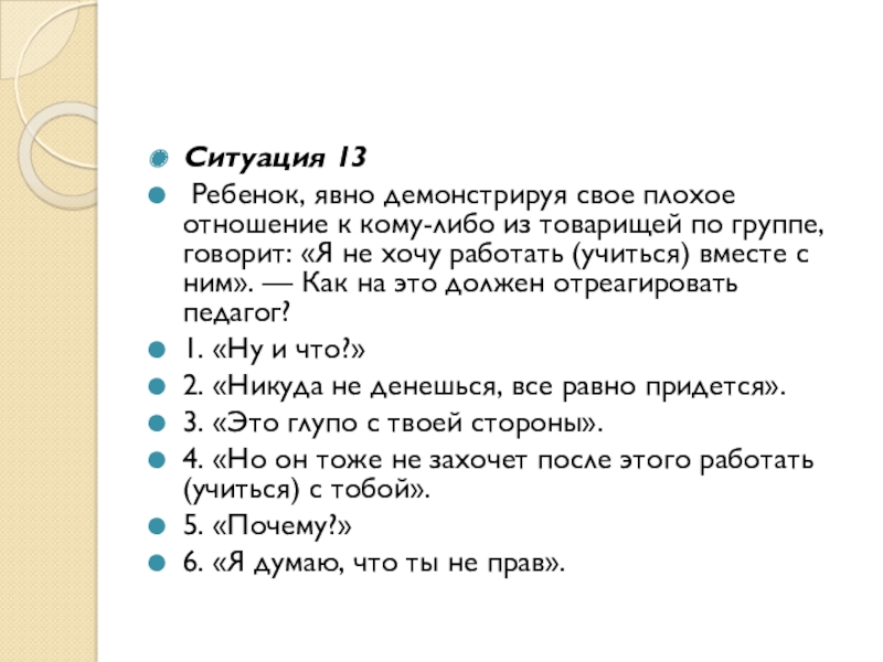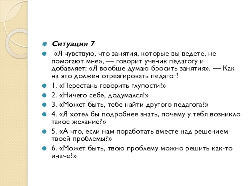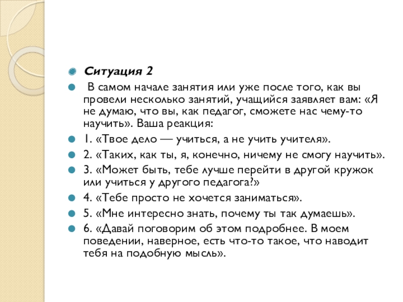 провели несколько занятий, учащийся заявляет вам: «Я не думаю, что вы, как педагог, сможете нас чему-то научить». Ваша реакция: