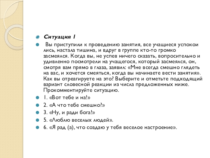 и вдруг в группе кто-то громко засмеялся. Когда вы, не успев ничего сказать, вопросительно и удивленно посмотрели на учащегося, который засмеялся, он, смотря вам прямо в глаза, заявил: «Мне всегда смешно глядеть на вас, и хочется смеяться, когда вы начинаете вести занятия». Как вы отреагируете на это? Выберите и отметьте подходящий вариант словесной реакции из числа предложенных ниже. Прокомментируйте ситуацию.
