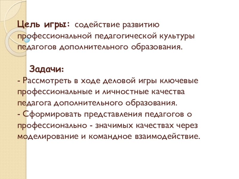 Слайд 2Цель игры: содействие развитию профессиональной педагогической культуры педагогов дополнительного образования.