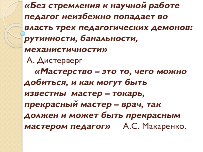 Слайд 4«Без стремления к научной работе педагог неизбежно попадает во власть трех