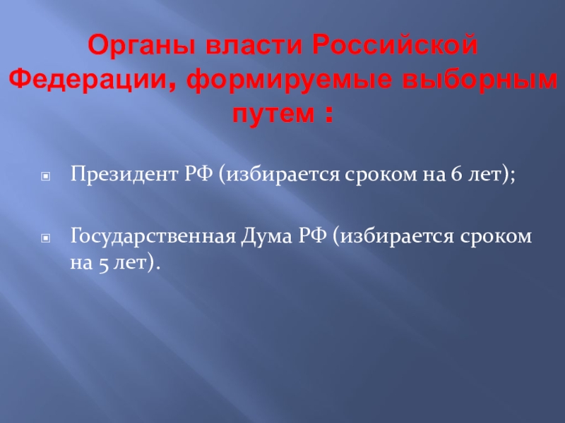 Слайд 7Органы власти Российской Федерации, формируемые выборным путем :