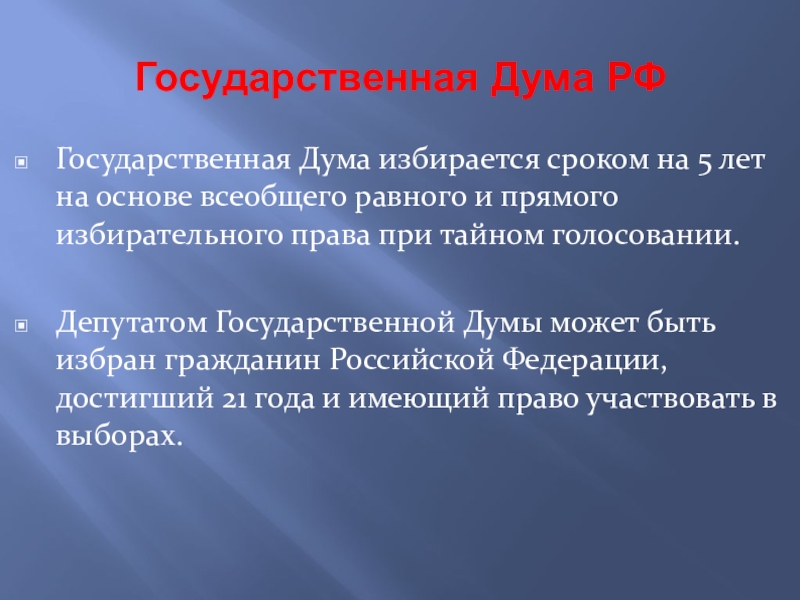 Государственная Дума РФ (избирается сроком на 5 лет).