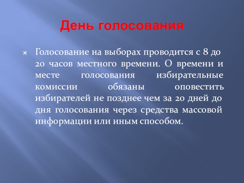 времени. О времени и месте голосования избирательные комиссии обязаны оповестить избирателей не позднее чем за 20 дней до дня голосования через средства массовой информации или иным способом.