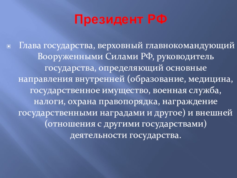 Глава государства, верховный главнокомандующий Вооруженными Силами РФ, руководитель государства, определяющий