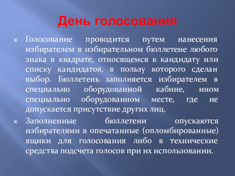 в квадрате, относящемся к кандидату или списку кандидатов, в пользу которого сделан выбор. Бюллетень заполняется избирателем в специально оборудованной кабине, ином специально оборудованном месте, где не допускается присутствие других лиц.