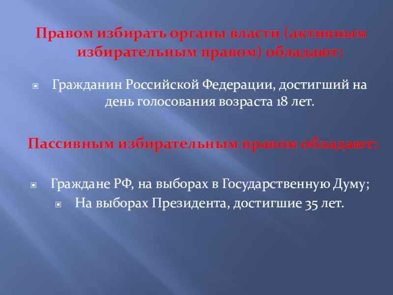 Слайд 16Правом избирать органы власти (активным избирательным правом) обладают: