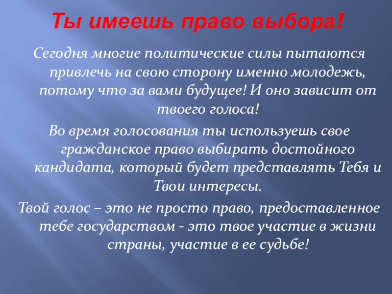 Твой голос – это не просто право, предоставленное тебе государством - это твое участие в жизни страны, участие в ее судьбе!