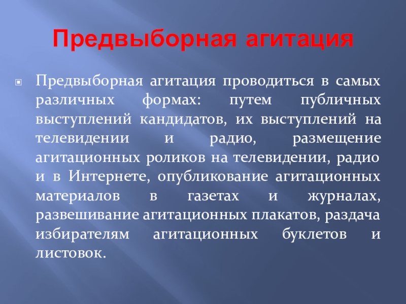 кандидатов, их выступлений на телевидении и радио, размещение агитационных роликов на телевидении, радио и в Интернете, опубликование агитационных материалов в газетах и журналах, развешивание агитационных плакатов, раздача избирателям агитационных буклетов и листовок.