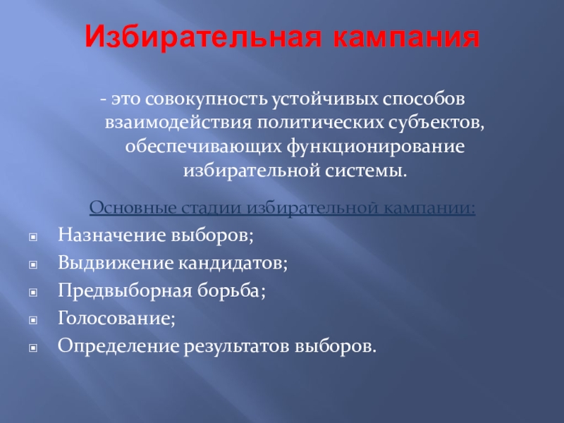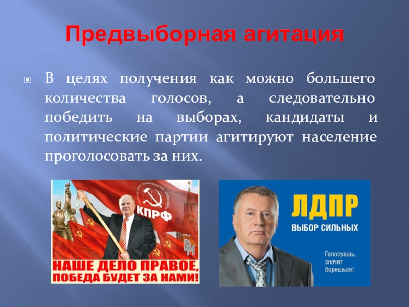 победить на выборах, кандидаты и политические партии агитируют население проголосовать за них.