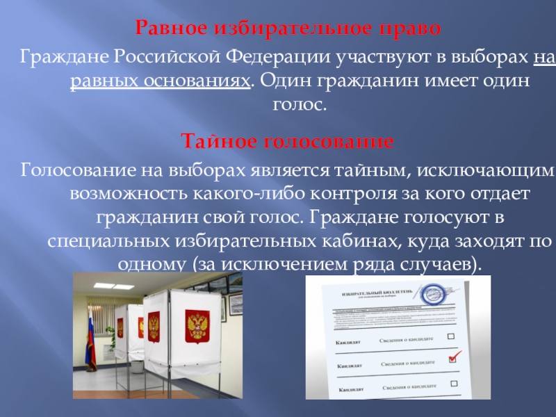 Голосование на выборах является тайным, исключающим возможность какого-либо контроля за кого отдает гражданин свой голос. Граждане голосуют в специальных избирательных кабинах, куда заходят по одному (за исключением ряда случаев).