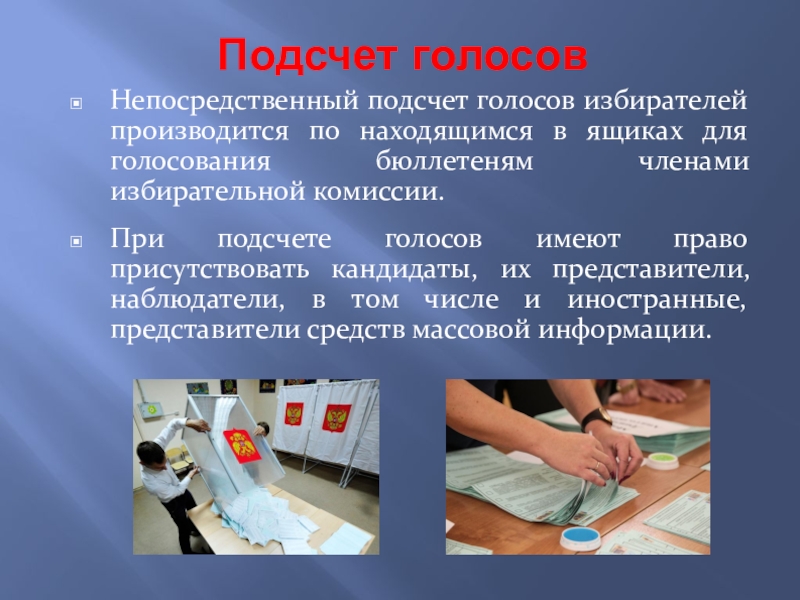 При подсчете голосов имеют право присутствовать кандидаты, их представители, наблюдатели, в том числе и иностранные, представители средств массовой информации.