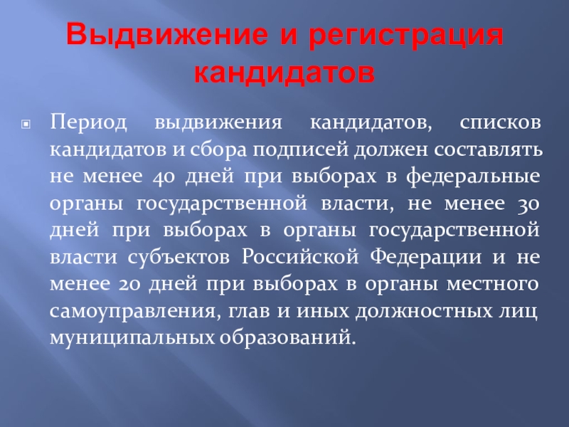должен составлять не менее 40 дней при выборах в федеральные органы государственной власти, не менее 30 дней при выборах в органы государственной власти субъектов Российской Федерации и не менее 20 дней при выборах в органы местного самоуправления, глав и иных должностных лиц муниципальных образований.