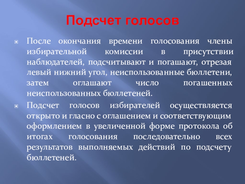 Подсчет голосов избирателей осуществляется открыто и гласно с оглашением и соответствующим оформлением в увеличенной форме протокола об итогах голосования последовательно всех результатов выполняемых действий по подсчету бюллетеней.