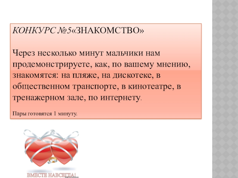Но от красоты своей подруги у вас пропал дар речи, и поэтому вам предстоит объяснить ей, что вы хотите подарить, используя только жесты. А что именно вы будете дарить, решит жребий.
