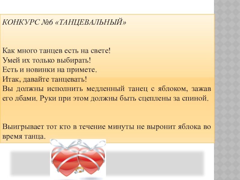 Вы должны исполнить медленный танец с яблоком, зажав его лбами. Руки при этом должны быть сцеплены за спиной.