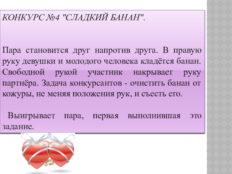девушки и молодого человека кладётся банан. Свободной рукой участник накрывает руку партнёра. Задача конкурсантов - очистить банан от кожуры, не меняя положения рук, и съесть его.