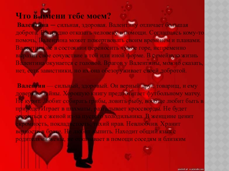 большая доброта. Ей трудно отказать человеку в помощи. Соглашаясь кому-то помочь, Валентина может пожертвовать своим временем и планами. Валентина не в состоянии переносить чужое горе, непременно выразит свое сочувствие в той или иной форме. В семейную жизнь Валентина окунается с головой. Врагов у Валентины, можно сказать, нет, есть завистники, но их она обезоруживает своей добротой.