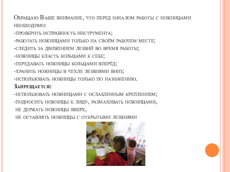 Слайд 14Обращаю Ваше внимание, что перед началом работы с ножницами необходимо: