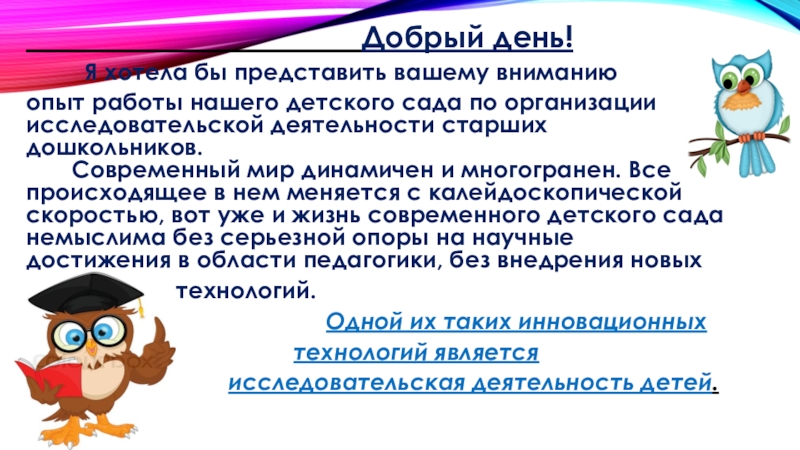 Современный мир динамичен и многогранен. Все происходящее в нем меняется с калейдоскопической скоростью, вот уже и жизнь современного детского сада немыслима без серьезной опоры на научные достижения в области педагогики, без внедрения новых