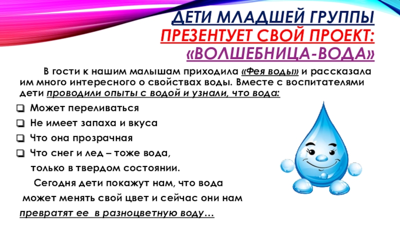гости к нашим малышам приходила «Фея воды» и рассказала им много интересного о свойствах воды. Вместе с воспитателями дети проводили опыты с водой и узнали, что вода: