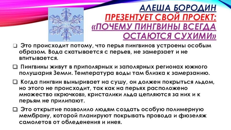 Когда пингвин выныривает на сушу, он должен покрыться льдом, но этого не происходит, так как на перьях расположено множество «крючков», кристалики льда цепляются за них и к перьям не прилипают.