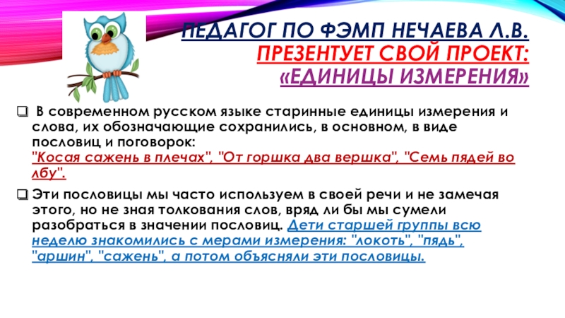 Эти пословицы мы часто используем в своей речи и не замечая этого, но не зная толкования слов, вряд ли бы мы сумели разобраться в значении пословиц. Дети старшей группы всю неделю знакомились с мерами измерения: "локоть", "пядь", "аршин", "сажень", а потом объясняли эти пословицы.