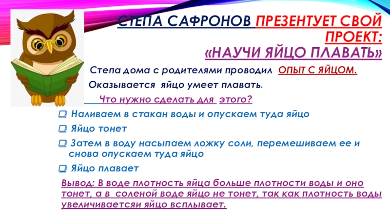 Вывод: В воде плотность яйца больше плотности воды и оно тонет, а в соленой воде яйцо не тонет, так как плотность воды увеличиваетсяи яйцо всплывает.