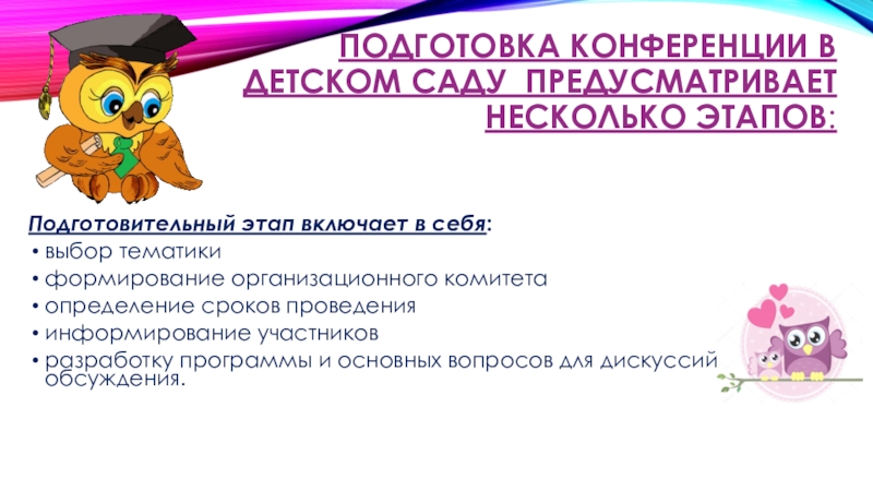 Слайд 4Подготовка конференции в детском саду предусматривает несколько этапов: