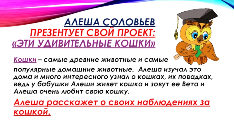 популярные домашние животные. Алеша изучал это дома и много интересного узнал о кошках, их повадках, ведь у бабушки Алеши живет кошка и зовут ее Вета и Алеша очень любит свою кошку.