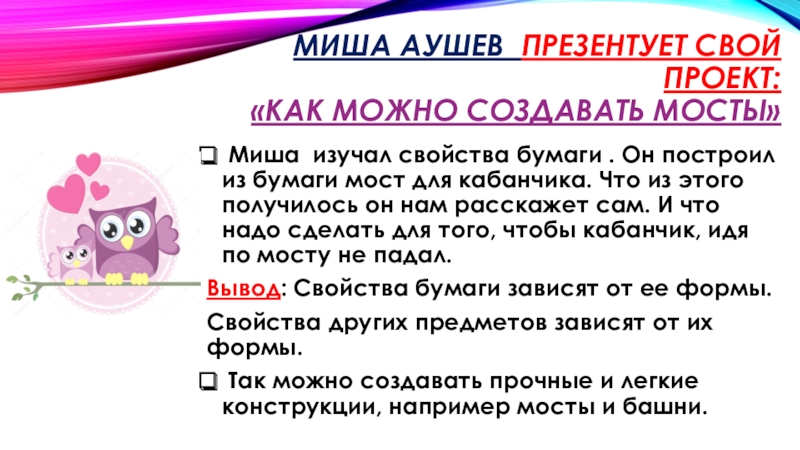 бумаги . Он построил из бумаги мост для кабанчика. Что из этого получилось он нам расскажет сам. И что надо сделать для того, чтобы кабанчик, идя по мосту не падал.