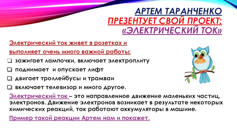Электрический ток – это направленное движение маленьких частиц, электронов. Движение электронов возникает в результате некоторых химических реакций, так работают аккумуляторы в машине.