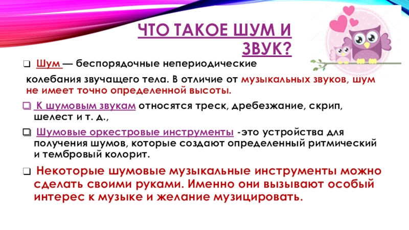 Шумовые оркестровые инструменты -это устройства для получения шумов, которые создают определенный ритмический и тембровый колорит.